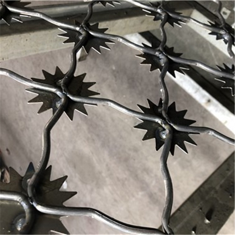 2、網(wǎng)片為菱形網(wǎng)孔,網(wǎng)格尺寸:120mm*110mm(高*寬),網(wǎng)絲直徑8mm,采用S195線材高壓焊接,每一個焊點附焊梅花刺一個。