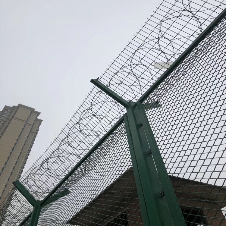 立柱的頂部焊接v型彎頭,這種立柱也叫做Y型立柱,頂部用以架設(shè)蛇腹形刀刺網(wǎng),與下部的監(jiān)獄護欄網(wǎng)完美結(jié)合,形成一道難以
