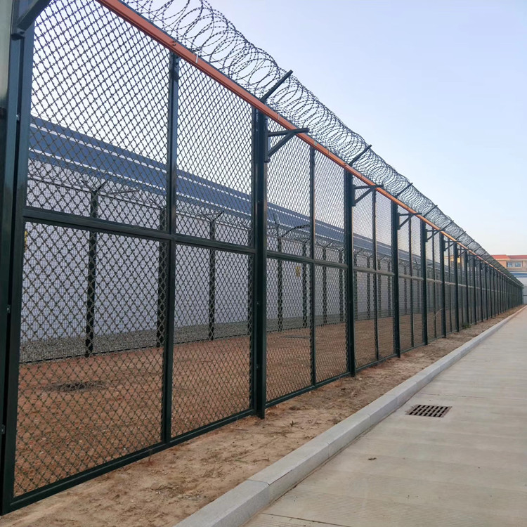 4.V型頂端安裝刀片刺網(wǎng),直徑采用50cm-60cm刀片刺網(wǎng)主 要是由熱鍍鋅鋼板或不銹鋼薄板沖壓而成的,它擁有尖銳的刀片,高張力鍍鋅鋼絲或者不銹鋼絲做芯線組合而成的產(chǎn)品。內(nèi)側(cè)或頂部加裝輪腹形刀刺網(wǎng),形成一道高不可可攀、難以途越的隔離障礙。配臺(tái)高壓打擊電網(wǎng)、各種監(jiān)控報(bào)警設(shè)備確保監(jiān)監(jiān)獄安全萬無一失。