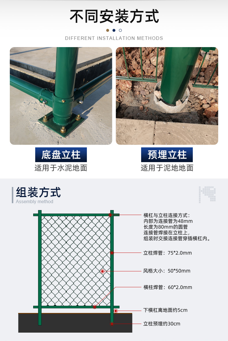 安裝方式:立柱預埋安裝,套管連接網框,安裝方便簡易。外觀美觀