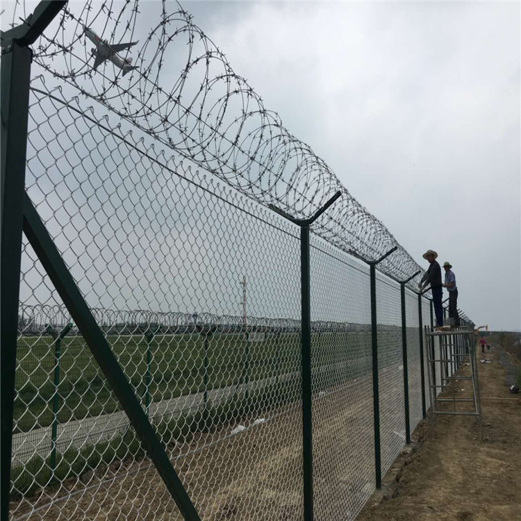 機場護欄網又被稱作“機場圍欄"、“機場護欄"、 "V 型安全防御護網”。 機場護欄網主要用于機場護欄使用,產品選用優級低碳鋼絲、鋁鎂合金絲,噴塑。經過編焊而成;網格結構簡練、便于運輸、安裝不受地形起伏限制,特別是對于山地、坡地、多彎地帶適應性極強。機場護欄網的主要特點是網身高大,防攀爬能力強,抗沖擊,表面雙層優質防腐處理,可達到10年的超長壽命, 一經推出,就得到了各大機場的高度認可,安平艾瑞護欄網廠生產的機場護欄網具有美觀、經濟實用、防阻效果好、施工便利等優異特點,主要用于工礦企業,園林公寓,邊防哨所,監獄等園禁防護。機場護欄網是由 V型支架立拄,加強型焊接片網,安全防盜連接件和熱鍍鋅刀片刺籠組成是強度和安全防御性級別很高的防護安全效果。