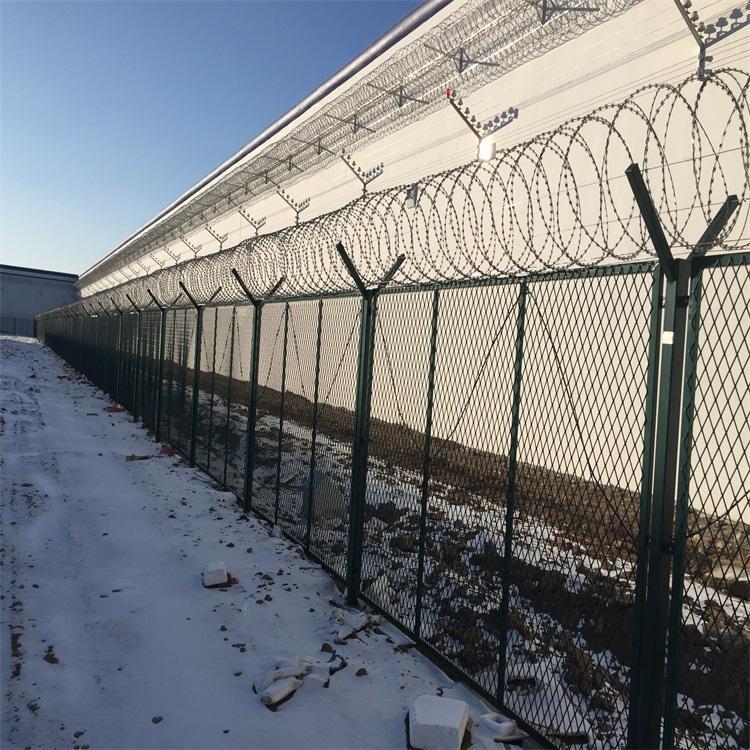 監(jiān)獄刀片網(wǎng)、看守所刀刺網(wǎng)、戒毒所刀刺網(wǎng),又名刮刀型刺絲,是一種發(fā)展起來的防護、隔離能力較強的新型防護網(wǎng)產(chǎn)品。鋒利的刀型刺由雙線扣裝后成蛇腹狀,既美觀又讓人不寒而栗。起到了很好的阻嚇作用。同時該產(chǎn)品具有美觀、防阻效果好、施工便利等優(yōu)點。
